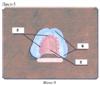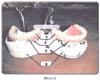 Затем начинаем постановку верхних центральных резцов так, чтобы режущий край касался и был установлен согласно отмеченной дуге на постановочной пластинке, центральная линия на постановочной пластинке совпадала с линией (мысленно), проведенной между центральными резцами.