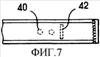 На фиг.7 показана дополнительная особенность. Когда фильтр закреплен в пакете, он обычно приварен к стенкам пакета вблизи выпуска, а также очень часто закреплен в другом месте. Так как фильтр имеет некоторую толщину и потому некоторую жесткость, то полезно было бы обеспечить возможность его перегиба в месте, расположенном выше по ходу потока от, по меньшей мере, одного впускного отверстия, чтобы помешать перегибу создать слишком большой перепад давления или даже полностью перегородить фильтр с блокированием любого удаления газов. Описанное свойство предпочтительного перегиба было бы выгодно получить формированием удлиненных перфораций, например, перфорации 42. Таким образом, упомянутая перфорация позволяет фильтру перемещаться во время деформации пакета, и поэтому проницаемый лист остается значительно удаленным от стенок пакета, чтобы допускать поступление газов. В предпочтительном варианте каждая перфорация, например 42, является достаточно узкой, чтобы два гидрофобных листа, расположенных по обеим сторонам фильтра, не могли приходить в контакт между собой, поскольку проникание газов стало бы нулевым в частях, находящихся в контакте.