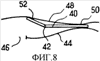На фиг.8 представлен вариант осуществления фильтра, встроенного в пакет, который решает вышеописанную проблему. В данном примере фильтр, типа изображенного на фиг.7, расположен между внутренней стенкой 44 пакета (на той же самой стороне, что и кожа пациента), имеющего проходное отверстие 46 для стомы и наружную стенку 48. Фильтр приварен в позиции 50 к двум стенкам так, что его выпуск выходит в атмосферу, но, предпочтительно, короче кромок стенок 44 и 48.