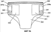 Фиг.3а и фиг.3b показывают дополнительный вариант осуществления изобретения. Фиг.3а показывает подгузник с язычками (307, 308) из ленты и двумя скрепляющими участками (320, 321) с петлями, размещенными на непроницаемом для жидкостей заднем листе (302). Язычки 307, 308 из ленты дополнительно предусмотрены с участками 307а, 307b с крючками. Каждый из участков с крючками дополнительно предусмотрен с постоянным магнитом 340, 341. Данная конструкция дополнительно описана в связи с фиг.4.