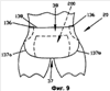 Каркасу 100 придается форма песочных часов путем удаления противолежащих в поперечном направлении частей каркаса 100 по меньшей мере в области 37 ластовицы, таких, как части 142, показанные на фиг.17, чтобы образовать противолежащие в поперечном направлении боковые выемки 139. Такое выполнение боковых выемок 139 в каркасе делает его латеральный размер вблизи поперечной оси 44 меньше, чем его латеральный размер у передней поясной кромки 136 и задней поясной кромки 138, т.е. делает каркас уже в области 37 ластовицы, чем на поясных кромках 136 и 138.