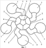 Ближайшим аналогом является массажер, содержащий пять коленообразных держателей с расположенными на их концах каплеобразными массажными элементами, находящимися на одной плоскости, основание, к которому прикреплены концами коленообразные держатели, выполненные с правосторонним или левосторонним изгибом соответственно по часовой или против часовой стрелки относительно оси симметрии основания (см., например, свидетельство на полезную модель Российской Федерации 35225, МПК 7 А61Н 15/00, дата публикации 2004.01.10).