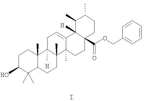 Изобретение относится к области фармацевтики. Получают бензилурсолат формулы I: