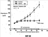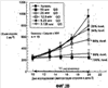 Фигура 5. Ежедневное пероральное введение соединения 1 бестимусным мышам с установленными трансплантатами опухоли NCI-H441 или РС-3. Фигура 5А: регрессия опухоли NCI-H441 у бестимусных мышей. Фигура 5В: регрессия опухоли у бестимусных мышей с установленными трансплантатами опухоли РС-3.
