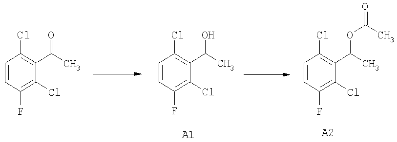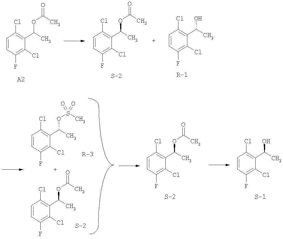 (1S)-1-(2,6-Дихлор-3-фторфенил)этанол, обозначенный на приведенных ниже схемах как соединение (S-1), получают сочетанием ферментативного гидролиза рацемического 1-(2,6-дихлор-3-фторфенил)этилацетата, этерификацией и химическим гидролизом с инверсией согласно схеме В. Рацемический 1-(2,6-дихлор-3-фторфенил)этилацетат (соединение А2) получают согласно схеме А.