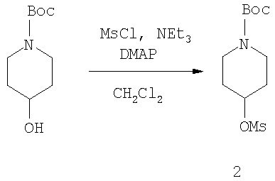 К раствору трет-бутилового эфира 4-гидроксипиперидин-1-карбоновой кислоты (7,94 г, 39,45 ммоль) в CH2Cl2 (100 мл), охлажденному до 0°С, при перемешивании постепенно добавляют NEt3 (5,54 мл, 39,45 ммоль), а затем метансульфонилхлорид (3,06 мл, 39,45 ммоль) и DMAP (48 мг, 0,39 ммоль). Смесь перемешивают при комнатной температуре в течение ночи. К смеси добавляют воду (30 мл). Экстракция CH2Cl2 (3 × 30 мл) с последующей сушкой (Na2SO4) и удаление растворителя в вакууме дают трет-бутиловый эфир 4-метансульфонилоксипиперидин-1-карбоновой кислоты (11,00 г, выход >99%). 1Н-ЯМР (CDCl3, 400 МГц) 4,89 (м, 1Н), 3,69 (м, 2Н), 3,31 (м, 2Н), 3,04 (с, 3Н), 1,95 (м, 2Н), 1,83 (м, 2Н), 1,46 (с, 9Н).
