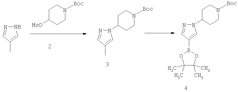 К раствору 4-иодпиразола (0,57 ммоль) в ДМФА (2 л) при перемешивании при 4°С добавляют по частям NaH (1,2 экв., 0,68 ммоль). Полученную смесь перемешивают в течение 1 часа при 4°С и затем добавляют соединение 2 – трет-бутиловый эфир 4-метансульфонилоксипиперидин-1-карбоновой кислоты (1,1 экв., 0,63 ммоль). Полученную смесь греют при 100°С в течение 12 часов. Реакцию гасят Н2О и смесь экстрагируют несколько раз EtOAc. Объединенные органические слои сушат, фильтруют и концентрируют, и получают оранжевое масло. Остаток очищают хроматографией на силикагеле (элюирование смесью 5% EtOAc в пентане), и получают соединение 3 в виде белого твердого вещества (140 г, 66%).