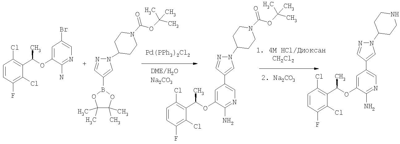 К раствору 3-[(R)-1-(2,6-дихлор-3-фторфенил)этокси]-5-(4,4,5,5-тетраметил[1,3,2]диоксаборолан-2-ил)пиридин-2-иламина (15,22 г, 35,64 ммоль) и трет-бутилового эфира 4-(4-бромпиразол-1-ил)пиперидин-1-карбоновой кислоты (14,12 г, 42,77 ммоль) в DME (143 мл) при перемешивании добавляют раствор Na2CO3 (11,33 г, 10692 ммоль) в воде (36 мл). Раствор обезгаживают и загружают три раза азотом. К раствору добавляют Pd(PPh3)2Cl2 (1,25 мг, 1,782 ммоль). Реакционный раствор снова обезгаживают азотом три раза. Реакционный раствор перемешивают на масляной бане, 87°С, в течение примерно 16 часов (или до тех пор, пока не израсходуется боранпинаколовый эфир), охлаждают до температуры окружающей среды и разбавляют EtOAc (600 мл). Реакционную смесь фильтруют через слой целита и промывают EtOAc. Раствор в EtOAc промывают рассолом, сушат над Na2SO4, фильтруют и концентрируют. Сырой продукт реакции очищают на колонке с силикагелем с элюированием системой EtOAc/гексан (колонка Biotage 90+, уравновешивается 600 мл 100% гексана, сегмент 1: 2250 мл 50% EtOAc/гексан линейный, сегмент 2: 4500 мл 75% EtOAc/гексан линейный, сегмент 3: 4500 мл 100% EtOAc), и получают трет-бутиловый эфир 4-(4-{6-амино-5-[(R)-1-(2,6-дихлор-3-фторфенил)этокси]пиридин-3-ил}пиразол-1-ил)пиперидин-1-карбоновой кислоты (11,8 г, выход 60%, чистота ~95%) с Rf 0,15 (50% EtOAc/гексан). МС m/e 550 (M+1)+.