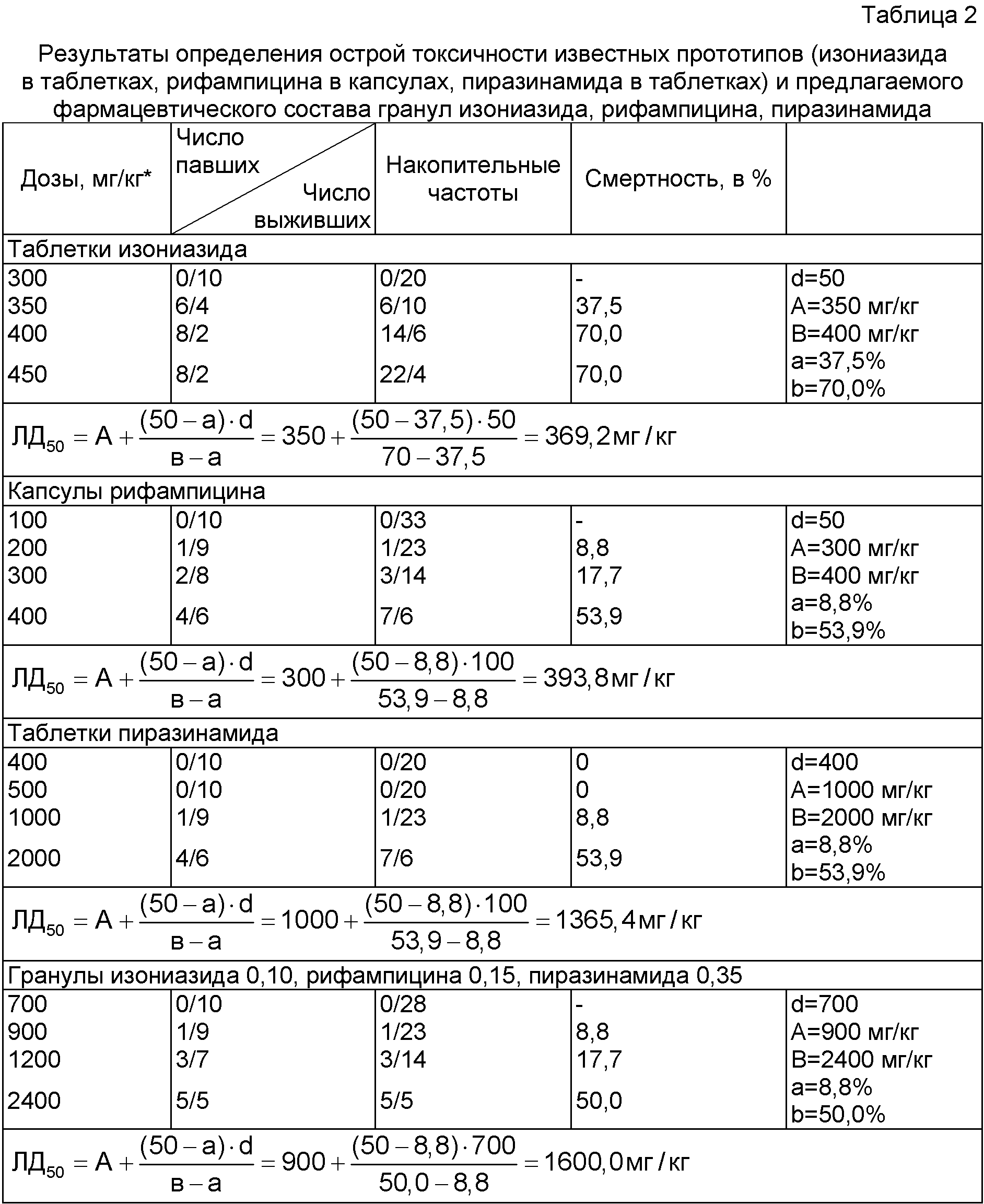Изобретение относится к области медицины и касается многокомпонентного фармацевтического состава, обладающего противотуберкулезной активностью и пригодного для лечения туберкулеза, вызванного изониазид-резистентными штаммами М.tuberculosis. Изменение социально-экономических условий и экологической обстановки в России привело в последние 10-15 лет к росту заболеваемости туберкулезом, которая в отдельных районах начинает принимать характер эпидемии. Фтизиатры отмечают не только рост заболеваемости, но и полирезистентность (устойчивость) возбудителя к однокомпонентным туберкулостатическим лекарственным средствам. Из уровня техники известны основные химиотерапевтические средства для лечения различных форм туберкулеза – производные изоникотиновой кислоты, прежде всего изониазид, а также антибиотики широкого спектра действия: стрептомицин, канамицин, рифампицин, обладающие высокой бактериостатической активностью в отношении микобактерий туберкулеза (Справочник Видаль Лекарственные препараты в России. Изд. 12-е переработанное, исправленное и дополненное. Астра Фарм Сервис, 2006 г., стр.1497, 1551, 1554). Благодаря высокой бактериостатической активности основным препаратом для лечения туберкулеза является изониазид. Особенностью терапии туберкулеза в настоящее время является одновременное назначение нескольких туберкулостатических лекарственных средств различных химических групп и механизмов действия. Достижение стойкого лечебного эффекта обеспечивается длительным курсом химиотерапии, который составляет от 6 до 12 месяцев; профилактические курсы проводят 2 раза в год продолжительностью 2-3 месяца (Фтизиатрия. Национальное руководство под ред. М.И.Прельмана, М.: ГЭОТАР-Медиа, 2007, стр.414-426). В связи с этим для обеспечения комфортности лечения больных целесообразно создание комплексных многокомпонентных лекарственных средств. Известны аналоги изобретения капсулы рифампицина, таблетки изониазида, таблетки пиразинамида (Справочник Видаль Лекарственные препараты в России. Изд. 12-е переработанное, исправленное и дополненное. Астра Фарм Сервис, 2006 г., стр.1497, 1551, 1554). Прототипом изобретения являются таблетки изониазида. Недостатками прототипа являются высокая токсичность, быстрая элиминация из организма, а также неудобство для применения больными, которое заключается в многократном ежедневном приеме нескольких таблеток в течение нескольких месяцев. В патенте РФ изониазида – 75,0 крахмальный клейстер 10% – 11,5 крахмал картофельный – 5,8 кислота стеариновая – 0,4 Субстанции изониазида, пиразинамида и рифампицина не обладают способностью к прямому таблетированию (Патент РФ Технической задачей предлагаемого изобретения является создание отечественного многокомпонентного состава для лечения туберкулеза, обладающего длительным сроком годности, высокой туберкулостатической активностью по отношению к микобактерии туберкулеза, устойчивых к изониазиду, а так же пониженной токсичностью. Данная техническая задача достигается за счет синергизма действующих веществ, введенных в композицию ингредиентов в гранулах на 100 г: