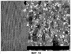 Фиг.15 показывает морфологию имплантата, в котором ядро нагружено примерно 4, 20 и 30 мас.% сульфата бария. Можно увидеть, что яркие пятна, представляющие собой сульфат бария, располагаются в основном в материале EVA-28, то есть серые/черные пятна нерегулярной формы, представляющие собой кристаллы этоногестрела, не содержат ярких пятен. Фиг.16 показывает такой же образец, из которого произошло вымывание гормона. Пустая часть представляет собой материал оболочки, в то время как часть, содержащая яркие пятна, показывает вымывание гормона из ядра. Четко видны темные дыры. Дыры, представляющие собой положения, в которых кристаллы этоногестрела находились перед вымыванием гормона, едва ли содержат какие-либо яркие точки.