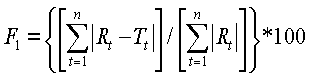 где Rt представляет собой сравнительный анализ в момент времени t, Tt представляет собой исследуемый анализ в момент времени t, и n представляет собой количество анализируемых точек. Значения F1 до 15 (0-15) дают уверенность в сходстве или эквивалентности двух кривых. Кривая сравнения выбирается так, что другие контролируемые параметры высвобождения кроме того, что исследуется, поддерживаются настолько постоянными, насколько это возможно.
