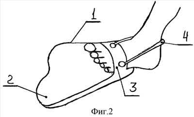 Сущность изобретения поясняется чертежами, где на фиг.1 показан ласт с наружным заднебоковым расширением в качестве обуви для ходьбы и бега на стопе пользователя, вид сверху; на фиг.2 – ласт в рабочем положении для плавания с боковым расширением и дополнительным креплением в области ахиллова сухожилия пользователя; на фиг.3 – ласт с прямой удлиненной пяточной областью в положении для ходьбы и бега, вид сбоку; на фиг.4 – ласт с прямой удлиненной областью в рабочем положении для плавания, вид сбоку; на фиг.5 – ласт с расширенной вильчатой удлиненной пяточной областью с элементами крепления на щиколотке пользователя, вид сверху.