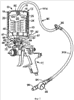 1. Устройство для подачи жидкости для использования с устройствами для распыления жидкости, поступающей самотеком, имеющее впускной канал, включающее резервуар из жесткого материала, имеющий боковую стенку, которая имеет верхний и нижний концы, и нижнюю стенку, проходящую по нижнему концу указанной боковой стенки, причем указанный резервуар имеет внутреннюю поверхность, образующую полость в указанном резервуаре, а указанный верхний конец указанной боковой стенки образует отверстие, ведущее в указанную полость, гибкий вкладыш, находящийся в полости указанного резервуара, каковой вкладыш имеет внешнюю поверхность, соответствующую по форме внутренней поверхности указанного резервуара, а внутренняя поверхность указанного вкладыша образует полость указанного вкладыша, а кольцевое устье по верхнему краю боковой стенки образует отверстие, ведущее в полость указанного вкладыша, переходный узел, состоящий из центральной части, имеющей сквозное отверстие, которая предназначена для подсоединения к впускному каналу устройства для распыления жидкости, поперечной части, имеющей внешнюю деталь для соединения с указанным гибким вкладышем вблизи указанного верхнего конца указанного резервуара, и приспособлений для разъемного закрепления гибкого вкладыша вокруг указанной внешней детали переходного узла, при этом в обычном положении резервуар, гибкий вкладыш располагаются над устройством для распыления жидкости, узел подачи воздуха, подсоединенный к указанному резервуару для подачи сжатого воздуха под низким давлением в промежуток между внешней поверхностью указанного гибкого вкладыша и внутренней поверхностью указанного резервуара, приспособленный для подсоединения к ниппелю отбора воздуха на устройстве для распыления жидкости, сообщающемуся с источником сжатого воздуха, используемого для формирования струи распыленной жидкости, выходящей из сопла распылителя.