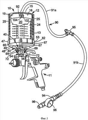 На фиг.3 показано использование устройства для подачи жидкости 10, являющегося предметом настоящего изобретения, для подачи распыляемой жидкости в устройство для распыления подаваемой самотеком жидкости или краскопульт 111, имеющий 1/8-дюймовый ниппель отбора сжатого воздуха, подсоединенный к и выступающий из обычно верхней стороны одной из двух воздушных горловин 116, находящихся по бокам выходного сопла распылителя 111. Через указанный ниппель 114 поступает, в сущности, тот же сжатый воздух, что и воздух, подаваемый через выходные отверстия в воздушных горловинах 116 для формирования выходящей из сопла распыленной струи (например, для придания распыленной струе овальной, круглой или веерообразной формы). Примером такого распылителя 111с указанным выходным ниппелем 114 является распылитель, серийно выпускаемый компанией Sata, Farbspritzechnik GmbH & Co., Корнвестхайм, Германия, под торговым названием “SATA” (t.m.) NR-95″, который был модифицирован для использования комплекта “HVLP Pro Upgrade”, серийно выпускаемого компанией Lex-Aire Products, Inc., г.Норт Биллерика, шт.Массачусетс, США. Устройство для подачи жидкости 10, использованное на распылителе 111, имеет те же детали, обозначенные теми же цифрами, указанными выше со ссылкой на фиг.1 и 2, за исключением того, что первый отрезок гибкого трубопровода 91а узла подачи воздуха 90 подсоединен к и отбирает сжатый воздух от распылителя 111 через выходной ниппель 114, а не через клапан сброса давления 95, трубопровод 91b и редуктор 94, показанные на фиг.1. Сжатый воздух поступает только через ниппель 114 и подается между внешней поверхностью указанного гибкого вкладыша 20 и внутренней поверхностью 19 резервуара 12, когда оператор включает распылитель 111, вручную нажимая курок 112 распылителя 111. Когда курок 112 отпускается, давление воздуха между внешней поверхностью указанного гибкого вкладыша 20 и внутренней поверхностью 19 резервуара 12 сбрасывается до атмосферного через распылитель 111. Таким образом, если распылитель 111 включается только путем периодического нажатия курка 112 (как это обычно и бывает), сжатый воздух с давлением, превышающим атмосферное, периодически подается между внешней поверхностью указанного гибкого вкладыша 20 и внутренней поверхностью 19 резервуара 12 при нажатии на курок 112, и сбрасывается, когда курок 112 отпускается. Сжатый воздух, поступающий через ниппель 114 при нажатии на курок 112, имеет давление в интервале примерно от 0.5 до 8 фунтов на квадратный дюйм или от 3.5 до 55 килопаскалей для различных условий эксплуатации распылителя 111, когда давление в трубопроводе, подсоединенном к распылителю 11 превышает 45 фунтов на квадратный дюйм или 310 килопаскалей. Было установлено, что описанная подача сжатого воздуха между внешней поверхностью указанного гибкого вкладыша 20 и внутренней поверхностью 19 резервуара 12 существенно улучшает протекание жидкости через распылитель 111 и позволяет использовать распылитель 111 в любом положении, в том числе в перевернутом, даже если вкладыш 20 и резервуар 12 имеют емкость в, по меньшей мере, 950 миллилитров или 32.1 унции и заполнены жидкостью, и получать продолжительную, рациональную, как правило, стабильную и единообразную форму распыляемой струи, которая представляется не сильно худшей или отличающейся от формы струи, создаваемой распылителем 111 при его использовании в нормальном вертика