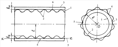 Внутренняя поверхность 1 выполнена, например, с поперечными (по отношению к образующей цилиндра) волнистыми гофрами 2, а внешняя поверхность 3 – с продольными волнистыми гофрами 4; высота гофров соответственно hв и h11, причем высота гофров равна 12 20 толщинам S листа соответствующей поверхности, а расстояние от центра О цилиндра до окружности 5 соприкосновения (во фронтальной проекции линия хх) гофров 2 и 4 l=(14 20)·hн.