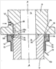 В левой части чертежа изображен альтернативный вариант. В то время как газораспределительная камера повышенного давления 34 находится прямо под газопроницаемым элементом 20, газовый канал 36 проходит от вышеуказанной газораспределительной камеры повышенного давления 34 (являющейся кольцеобразным элементом) до первой плоской контактной поверхности 18 в промежуточном положении между внутренней окружностью вышеуказанного газораспределительного элемента 20 и каналом 14 разливочной трубы.