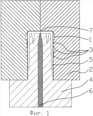 В соответствии с заявляемым изобретением подачу в зазор 5 расплава полимера 6 возможно осуществлять по каналу 7, выполненному в пуансоне 4.