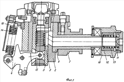 Рычаг-собачка 4 установлен шарнирно в проушине гильзы 2, пружина 14 растяжения одним концом соединена с рычагом-собачкой 4, а другим – с пальцем, установленным на направляющей 16, причем уплотняющий элемент состоит из пружины 13 и вкладыша 12. Вкладыш удерживается от радиального перемещения относительно обоймы фиксатором, который одновременно удерживает обойму 10 относительно корпуса 6.