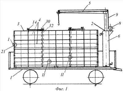 – в кузов мобильного средства (автомобиля, прицепа, самоходного шасси) рядом с краном жестко с возможностью съема и установки закреплен внешний контейнер с отсеками, куда устанавливают малые контейнеры со своими отсеками так, что внешние размеры малых контейнеров по ширине, высоте и толщине укладываются целое число раз для того, чтобы малые контейнеры могли помещаться внутри внешнего,