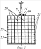 Рассмотрим рабочий процесс. Он состоит из двух периодов: загрузки и разгрузки. При загрузке внешний контейнер 3 пуст, тяги 11 опущены вертикально вниз и это положение показано штриховыми линиями на фиг.1 поз.32. Лебедкой 8 с помощью троса 9 и стрелы 5 загруженные товаром заранее контейнеры 4 опускаются в отсеки контейнера 3 до их заполнения, а т.к. размеры контейнеров 4 в целое число раз меньше соответствующих размеров внешнего контейнера 3, то на каждом размере их уместится, следовательно, то же целое число, и контейнер 3 будет заполнен полностью. Компенсаторы 21, взаимодействуя со стенками контейнеров, демпфируют возможные удары и предохраняют груз от деформирования. После окончания загрузки тяги 12 устанавливают на оси 13 и затягивают барашковыми гайками. При разгрузке процесс идет в обратном порядке: сначала открепляют тяги 12, устанавливают их вертикально вдоль длинного борта контейнера 3 и разгружают контейнер, причем барашковые гайки следует все-таки навернуть на оси 13 для предохранения резьбы этих осей от случайного деформирования при погрузке контейнеров 4 или одевать на оси 13 специальные предохранительные колпачки.