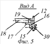 Рассмотрим устройство мобильного комплекса. Он состоит из транспортного средства 1, козлового крана 2, установленного в кузове, и рядом с ним жестко с возможностью съема установлен внешний контейнер 3 (показан жирными линиями) с отсеками, куда устанавливаются малые контейнеры 4 (показаны тонкими линиями) так, что внешние размеры малых контейнеров 4 по ширине, высоте и толщине укладываются целое число раз во внутренних соответствующих размерах внешнего контейнера 3, а в отсеки малых контейнеров 4 укладывают упаковки с размерами соответствующих отсеков малых контейнеров 4, например кассеты с рассадой. Стрела 5 крана 2 выполнена Т-образной формы с конусностью по вертикальному и боковым ребрам 1:10-1:15 с возможностью поворота на 70-90° с высотой подъема ее больше наибольшей из имеющихся высот малых контейнеров 4. Сверху корпуса 6 гидроцилиндра 7 и сзади его вертикальной оси по отношению к направлению движения жестко прикреплена лебедка 8 с гидродвигателем 10 и муфтой свободного хода 11, а по обе стороны от поперечной оси симметрии контейнера 3 шарнирно на одинаковом расстоянии установлены плоские прямоугольного сечения тяги 12 с отверстиями по концам, в одно из которых входит ось 13 с резьбой и барашковой гайкой 14, а в противоположное – -образный стержень 15, у которого верхний конец с резьбой и полка 16 выполнены круглыми, а нижний конец 17 равен по длине верхнему и квадратного сечения и прикрепляется он к вертикальной стойке 18 внешнего контейнера 3 жестко нижним концом 17 перпендикулярно полкой 16 к оси продольного стержня 19 внешнего контейнера 3 и заподлицо с ним. Длина каждой тяги 12 меньше, чем высота контейнера 3, и оба они изготовлены в виде решетчатых конструкций из металлических стержней коробчатой формы, а в местах их взаимного пересечения с внутренней стороны внешнего контейнера 3 с внешней стороны малых контейнеров 4 они соединяются заподлицо друг с другом и на внутренних сторонах стоек 20 внешнего контейнера 3 установлены компенсаторы 21, состоящие из двух взаимодействующих частей: подвижной 22, жестко прикрепленной симметрично сверху и снизу на крайних стойках 23 малых контейнеров 4 и неподвижной 24, жестко прикрепленных на вертикальных стойках 25 внешнего контейнера 3 так, чтобы после установки малых контейнеров 4 оси симметрии обеих частей компенсаторов 21 совпадали друг с другом. Подвижная часть 22 компенсатора 21 представляет собой основание 26 с завальцованным шариком 27 с возможностью его вращения, и он жестко прикрепляется с внутренней стороны коробчатого стержня 23 малого контейнера 3 заподлицо с наружной поверхностью этого стержня. Неподвижная часть 24 состоит из сердцевины 28, выполненной из эластичного материала, например резины, шириной меньше расстояния между внутренними стенками стержня 25 внешнего контейнера 3, где она установлена и с криволинейной верхней частью, которая выполнена, например, по параболе и выступает над поверхностью стержня 25 внешнего контейнера 3 на величину – принятого зазора. Сверху к криволинейной части сердцевины 28 жестко прикреплена металлическая пластина 29 с внутренней кривизной, равной кривизне сердцевины 28, равная ей по ширине, и проходит через отверстие в задней стенке стержня 25 внешнего контейнера 3 и заканчивается внутри него. Количество компенсаторов, установленных на любом размере малого ко