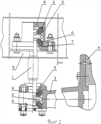 На штангу последовательно надеваются нижний внутренний кольцевой упругий элемент 6, опорная плита 5, опорная плита 7 и верхний внутренний кольцевой упругий элемент 6. После этого закрепляется верхний бурт 2, фиксируемый хвостовиком 10, и надеваются наружные кольцевые упругие элементы и далее производится сборка узлов крепления к раме тележки и редуктору.