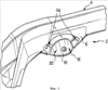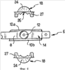 Узел 2 содержит седло 16. Оно содержит две детали 18, образующие в данном случае это седло. Детали 18 идентичны друг другу. Они также симметричны друг другу относительно вертикальной плоскости, расположенной вдоль направления движения автомобиля, когда детали 18 находятся в монтажном положении. Каждая деталь 18 содержит крышку 20, поверхность которой геометрически ограничена цилиндром, образующие которого показаны на фиг.1. Эти образующие наклонены в боковом направлении относительно вертикального направления в сторону другой детали 18. Крышка ограничена сверху верхним краем 22, расположенным в основном в вертикальной плоскости, и снизу – нижним краем 24, расположенным в основном в горизонтальной плоскости. Этот край содержит центральный вырез 26 в виде дуги окружности, который должен находиться напротив выступа 12. Он содержит также две боковые части 27, предназначенные для введения в поверхностный контакт с нижней стороной 14 основания 8 кронштейна 6 седла.