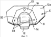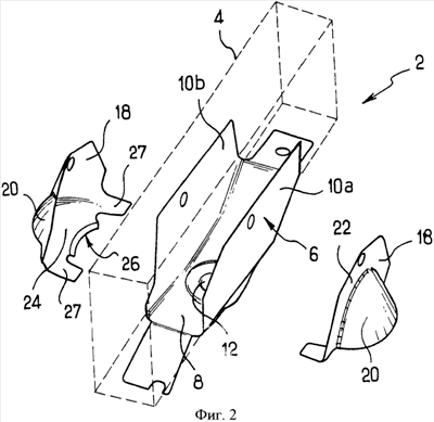 Детали 18 предназначены для крепления на кронштейне 6 по обе стороны от него напротив соответственно боковин 10а и 10b. Верхний край 22 каждой детали находится в этом случае в поверхностном контакте с наружной стороной соответствующей боковины, тогда как нижний край 24 находится в поверхностном контакте с нижней стороной основания 8.
