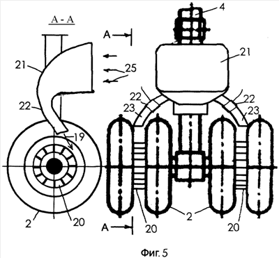 В следующем варианте устройство выполнено содержащим приводы, выполненные состоящими из установленных на корпусах 10 колес 2 шасси турбин 20 и закрепленных на стойках 4 диффузоров 21, оборудованных подведенными соплами к турбинам 20 колес 2 шасси сопловыми элементами 22, оснащенными автоматическими регуляторами 23 расхода воздуха известной конструкции (фиг.5).