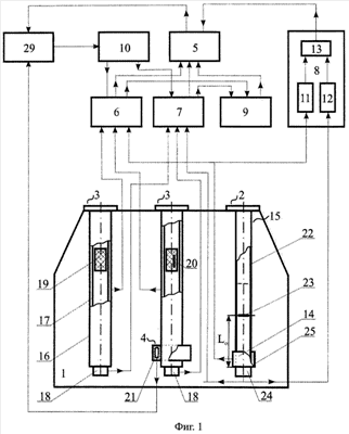 Выход каждого из электроемкостных датчиков уровня подсоединен к его внешнему электроду 16, а выход датчика диэлектрической проницаемости 14 подсоединен к кольцевому электроду 25. Каждый из этих выходов соединен с соответствующим входом первого блока измерения объема 6, а выход каждого из первых пьезоэлектрических преобразователей 18 и выход второго пьезоэлектрического преобразователя 24 соединены каждый с соответствующим входом второго блока измерения объема 7.