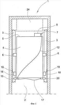Лифт 1, выполненный в соответствии с настоящим изобретением, показан на фиг.1, он содержит кабину 4 лифта, которая выполнена с возможностью перемещения ее в вертикальном направлении по направляющим рельсам 3, смонтированным внутри шахты 2 лифта. Кабина 4 лифта оборудована направляющими башмаками 6, обеспечивающими перемещение кабины 4 в строгом соответствии с направлением ее движения, задаваемым направляющими рельсами.
