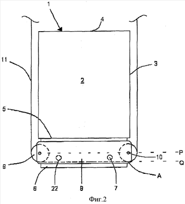Установочные оси 7 и соответствующие отверстия 22 расположены между первой линией Р, разделяющей пополам валы 10 шкивов, и второй линией Q, образующей нижнюю общую касательную между шкивами 9. В настоящем варианте выполнения нижняя общая касательная Q соответствует линии между нижними секциями А шкивов 9.