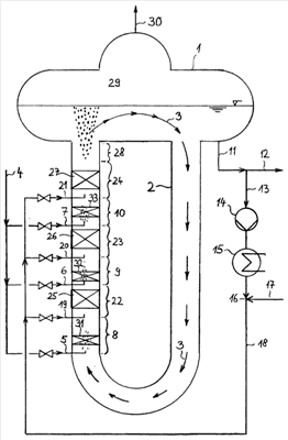 В верхней части петли 2 к зоне 24 реакции примыкает область 28 кипения, обозначенная на чертеже изображением пузырьков. Парообразный ДХЭ поступает в паровое пространство 29 газоотделителя 1 и отводится в качестве парообразного продукта 30 ДХЭ.