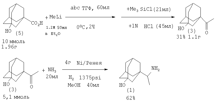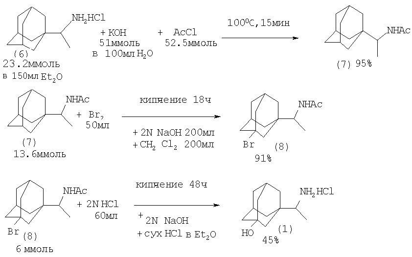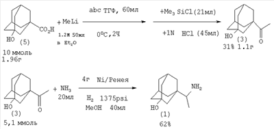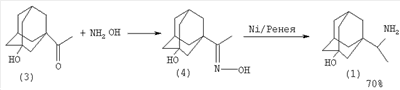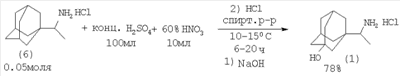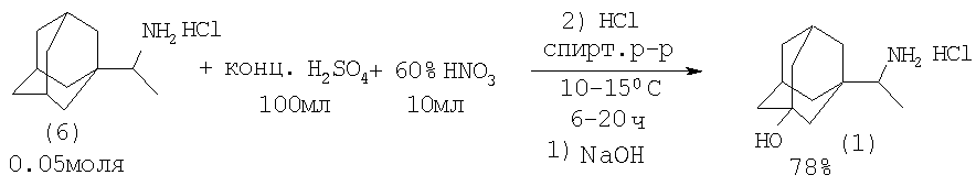 Изобретение относится к области органической химии, в частности к способу получения 3-гидроксиремантадина (гидрохлорида 1-(1-аминоэтил)-3-адамантанола). Производные адамантана обладают широким спектром биологической активности, такие лекарственные препараты на основе адамантана, как ремантадин, адапромин нашли применение для профилактики и раннего лечения гриппа. Наличие гидроксильной группы в адамантановом ядре снижает токсичность и расширяет антивирусный спектр действия (Е.И.Багрий. Адамантаны. М.: Наука, 1989, 264 с.[1]; В.И.Вотьяков, Е.И.Бореко, Г.В.Владыко и др. Перспективы развития химии каркасных соединений и их применение в отраслях промышленности. – Киев, 1986. С.12-16 [2]). 3-Гидроксиремантадин (1) (гидрохлорид 1-(1-аминоэтил)-3-адамантанол) можно получить из 3-бромадамантилкарбоновой кислоты (2). Вначале обработкой 3-бромадамантил-1-карбоновой кислоты (2) SOCl2, затем EtOMgCH(CO2Et)2 и кислотным гидролизом получают 1-ацетил-3-адамантанол (3) (выход 31%). 1-Ацетил-3-адамантанол вовлекается в реакцию с гидроксиламином, давая оксим (4). На последней стадии оксим (4) восстанавливают с помощью водорода никелем Ренея с получением целевого продукта – 3-гидроксиремантадина (выход 70%) (Г.И.Козушко, О.Миздох, В.И.Вотьяков, В.А.Русаев, В.Ф.Даниленко, Г.У.Степанова, К.И.Даниленко. Фарм.журн. (Киев), Недостатки метода: 1. Труднодоступность исходных реагентов 3-бромадамантанкарбоновой и этоксиброммалоновой кислот. 2. Многостадийность процесса. 3. Использование агрессивного SOCl2. 4. Токсичность гидроксиламина. 5. Низкий общий выход целевого продукта. Исходным соединением для получения 3-гидроксиремантадина (1) может служить 3-гидроксиадамантанкарбоновая кислота (5). На первой стадии оксикислоту (5) обрабатывают большим избытком метиллития с получением 1-ацетил-3-адамантанола (3), который при восстановительном аминировании с помощью жидкого аммиака и водорода под давлением в присутствии никеля Ренея при 100°С превращается в целевой 3-гидроксиремантадин с выходом 62% (H.Stetter, J.Meyer. Ber. Vol.95. Р.667 (1962) [4]; М.Л.Багал, В.И.Лантвоев. ЖОрХ Т.9, с.291 (1973) [5]). Метод имеет ряд существенных недостатков: 1. Необходимость использования большого избытка пожароопасного метиллития. 2. Использование абсолютированных растворителей. 3. Труднодоступность исходной гидроксикислоты. 4. Высокое давление водорода (~100 атм). Более коротким путем (3 стадии) 3-гидроксиремантадин (1) был получен из ремантадина (P.S.Manchand, R.L.Cerrut, J.A.Martin, C.H.Hill, J.H.Merett, E.Keech, R.B.Belshe, E.V.Connell, J.S.Sim. J.Med.Chem. V.33, Ацетилирование ремантадина (6) ацетилхлоридом привело к образованию ацетамида (7) с 95% выходом, обработка которого избытком брома дает 3-бром-1-ацетамидадамантан (8) (91%). Гидролиз (8) соляной кислотой приводит к целевому продукту с 45% выходом. Недостатки метода: 1. Использование большого избытка ядовитого брома. 2. Для проведения реакции гидролиза 3-бром-N-ацетил-1-(1-аминоэтил)адамантана, снятия ацетильной защиты и получения гидрохлорида 3-гидроксиремантадина требуется 10-20-кратный избыток NaOH и НСl, что приводит к образованию значительного количества сточных вод, содержащих NaOH и НСl, NaCl и СН3СООNа. 3. Низкий выход целевого продукта (суммарный выход (1), считая на 3 стадии, составляет 39%). Кратчайший путь синтеза 3-гидроксиремантадина заключается в окислении ремантадина смесью азотной и серной кислот (Л.Н.Лаврова, М.К.Индулен, Г.М.Рязанцева, В.С.Корытный, В.Г.Яшунский. Хим.-фар