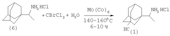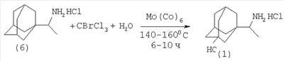 Изобретение относится к улучшенному способу получения 3-гидроксиремантадина, который обладает широким спектром биологической активности, применяется для профилактики и раннего лечения гриппа. Наличие гидроксильной группы в адамантановом ядре снижает токсичность и расширяет антивирусный спектр действия. Способ получения заключается в окислении (гидроксилировании) гидрохлорида ремантадина с помощью бромноватистой кислоты-НОВr, который в условиях реакции генерируется in situ из бромтрихлорметана-СВrСl3 и Н2О под действием Мо(СО)6. Процесс проводят при температуре 140-160°С в течение 6-10 часов, при мольном соотношении [ремантадин гидрохлорид]:[СВrСl3]: [Мо(СО)6]: [Н2O]=100:100:5:2000÷4000. Способ позволяет получить продукт с высоким выходом и высокого качества. В оптимальных условиях при конверсии ремантадина 90-99% единственным продуктом реакции является гидрохлорид 3-гидроксиремантадин. 1 табл.