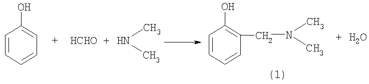 Известен способ [патент ЧССР, 163467] получения 2-[(диметиламино)метил]фенола реакцией между фенолом, формальдегидом и диметиламином (или его солянокислой солью) в среде диоксана при температурном режиме 60-85°С и использовании высаливающего агента (поваренная соль) на стадии выделения по схеме