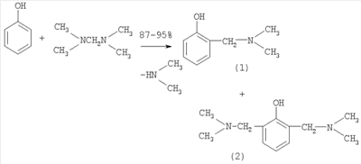 В известном способе используется реакция термического аминометилирования фенола с помощью бисамина. Реакция идет при температуре 80-110°С с образованием, наряду с целевым продуктом (87-95%), побочного 2,6-бис[(диметиламино)метил]фенола (3.0-9.0%).