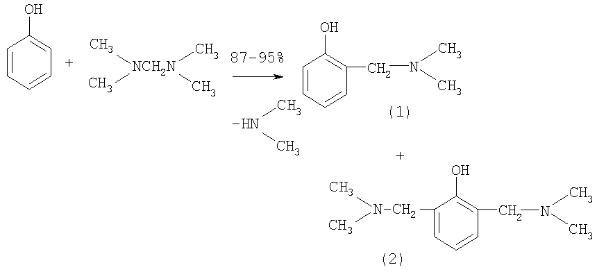 Известен способ [авторское свидетельство 1038339 СССР. Б.И. 32 (1983)] получения 2-[(диметиламино)метил]фенола (1) с выходами 87-95% взаимодействием фенола с N,N,N,N-тетраметилметандиамином (бисамин) в безводной среде при температуре 80-110°С в апротонных растворителях для предотвращения дальнейшего превращения продукта монозамещения в диаминометилированное производное фенола. Но даже соблюдение всех вышеописанных условий не позволяет получить целевой продукт без побочных соединений. Наряду с 2-[(диметиламино)метил]фенолом (1) реакционная масса содержит исходный фенол от 2.0 до 4.0%, а также 2,6-бис[(диметиламино)метил]фенол (2) в количестве от 3.0 до 9.0%.