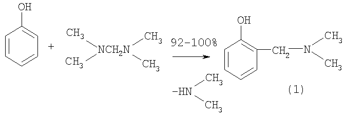 взаимодействием фенола с N,N,N,N-тетраметилметилендиамином, отличающийся тем, что реакцию проводят в присутствии катализатора хлорида меди (I) при мольном соотношении реагентов фенол: N,N,N,N-тетраметилметилендиамин: CuCl=10:(10-11):(0,2-0,4), атмосферном давлении, преимущественно при температуре 50°С, в течение 3,5-4,5 ч.