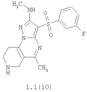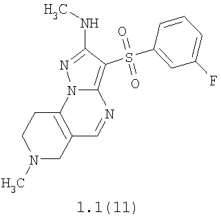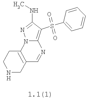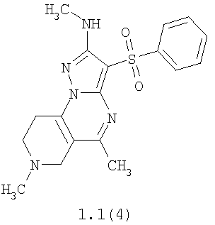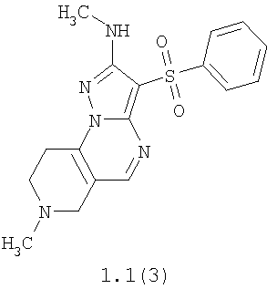 Пример 4. Получение лекарственного средства в форме таблеток. Смешивают 1600 мг крахмала, 1600 мг измельченной лактозы, 400 мг талька и 1000 мг гидрохлорида 2-метиламино-7-метил-3-фенилсульфонил-6,7,8,9-тетрагидро-пиразоло[1,5-а]пиридо[3,4-е]пиримидина 1.1(3)·HCl и спрессовывают в брусок. Полученный брусок измельчают в гранулы и просеивают через сита, собирая гранулы размером 14-16 меш. Полученные гранулы таблетируют в подходящую форму таблетки весом 560 мг каждая. Согласно изобретению аналогичным образом получают лекарственные средства, содержащие в качестве лекарственного начала другие соединения общей формулы 1.