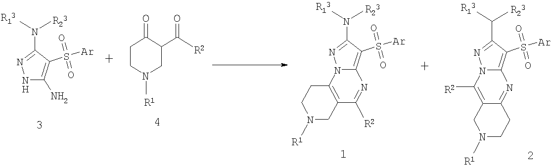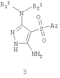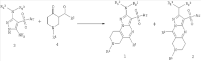 4. Способ получения соединений общей формулы 1 или 2 по любому из пп.1-3 взаимодействием 3-амино-4-арилсульфонил-2Н-пиразолов общей формулы 3 с соответствующими -дикетонами общей формулы 4,