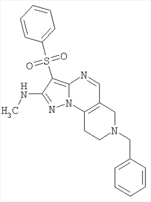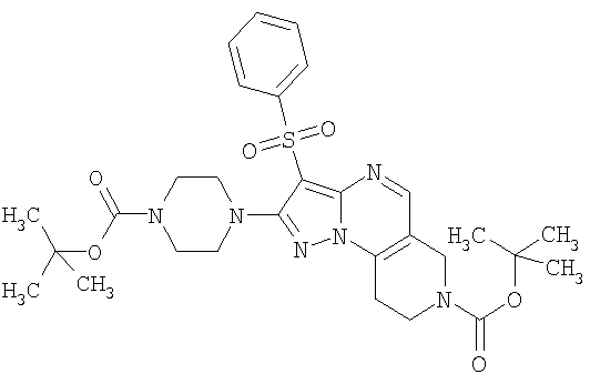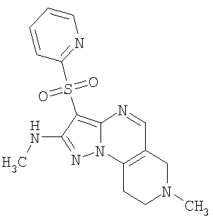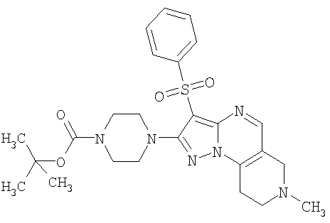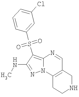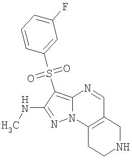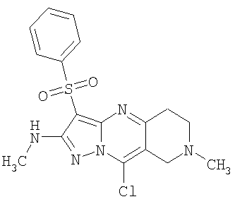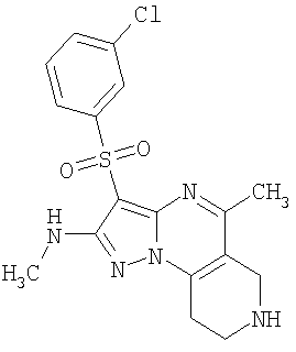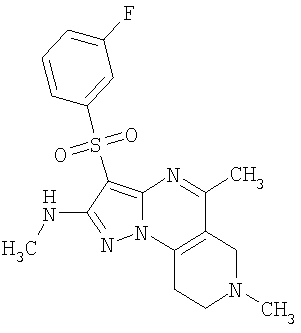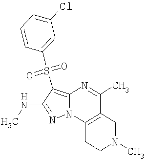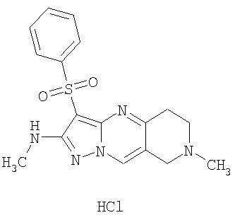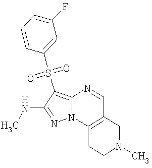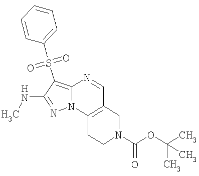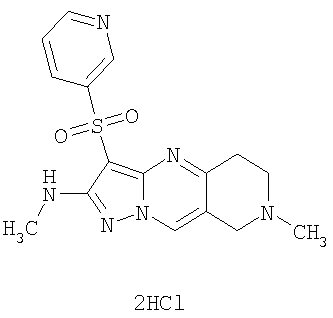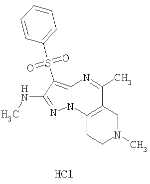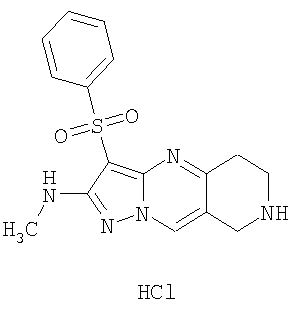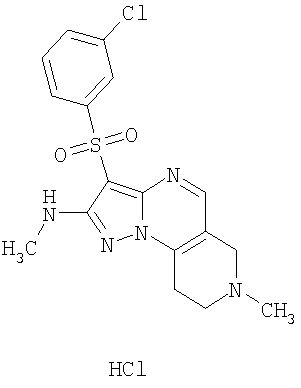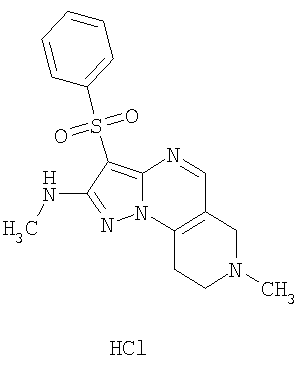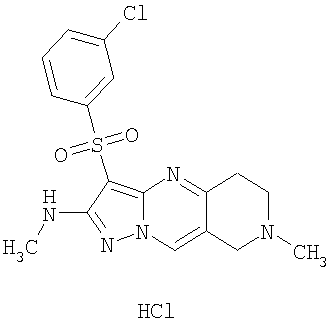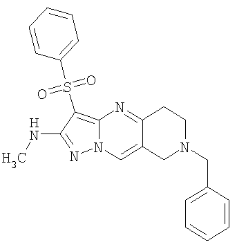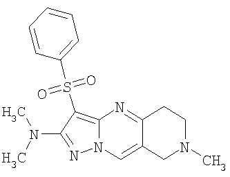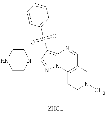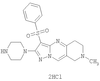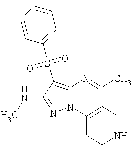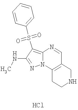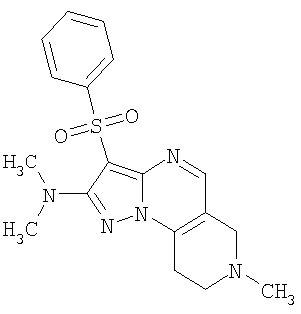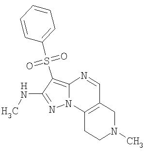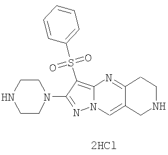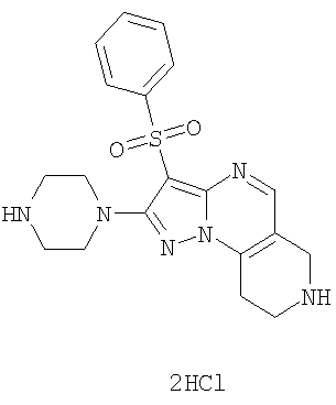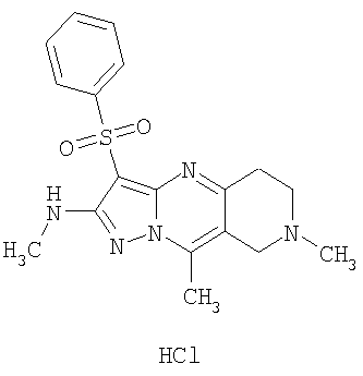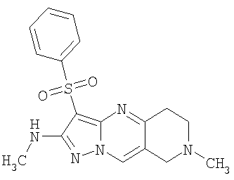 Пример 5. Получение лекарственного средства в форме капсул. Тщательно смешивают гидрохлорид 2-метиламино-7-метил-3-фенилсульфонил-6,7,8,9-тетрагидро-пиразоло [1,5-а] пиридо [3,4-е] пиримидина 1.1(3)·HCl с порошком лактозы в соотношении 2:1. Полученную порошкообразную смесь упаковывают по 300 мг в желатиновые капсулы подходящего размера.