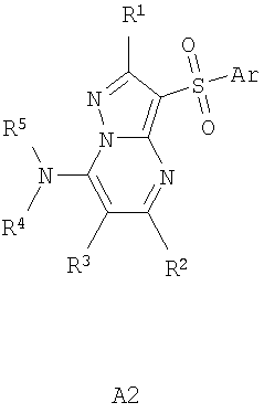 А2: Ar = арил, гетероциклил; R1=H, алкил, алкилтио; R2=H, алкил, галоген; R3=H, алкил, гидроксиалкил; R4 и R5=H; NR4R5 = пиперазинил.