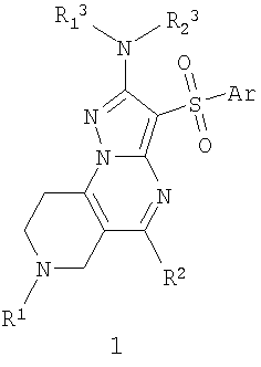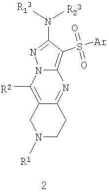 Данное изобретение относится к новьм арилсульфонил-азагетероциклическим соединениям, к новым антагонистам серотониновых 5-НТ6 рецепторов, к новым лекарственным началам, фармацевтическим композициям, лекарственным средствам и способам их получения. Более конкретно настоящее изобретение относится к антагонистам серотониновых 5-НТ6 рецепторов – новым замещенным 2-амино-3-сульфонил-6,7,8,9-тетрагидро-пиразоло[1,5-а]пиридо[3,4-е]пиримидинам и замещенным 2-амино-3-сульфонил-5,6,7,8-тетрагидро-пиразоло[1,5-а]пиридо[4,3-d]пиримидинам, лекарственным началам и фармацевтическим композициям, содержащим лекарственные начала в виде указанных соединений, а также к способу лечения и предупреждения развития различных заболеваний центральной нервной системы (ЦНС), в том числе когнетивных расстройств и нейродегенеративных заболеваний.