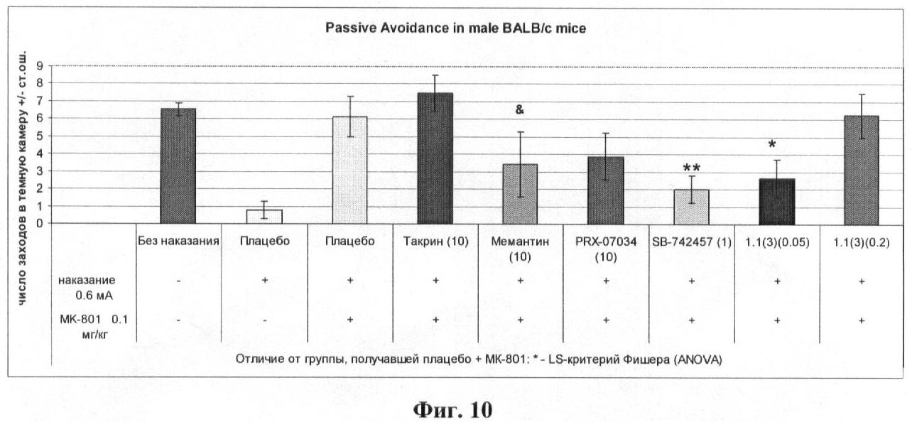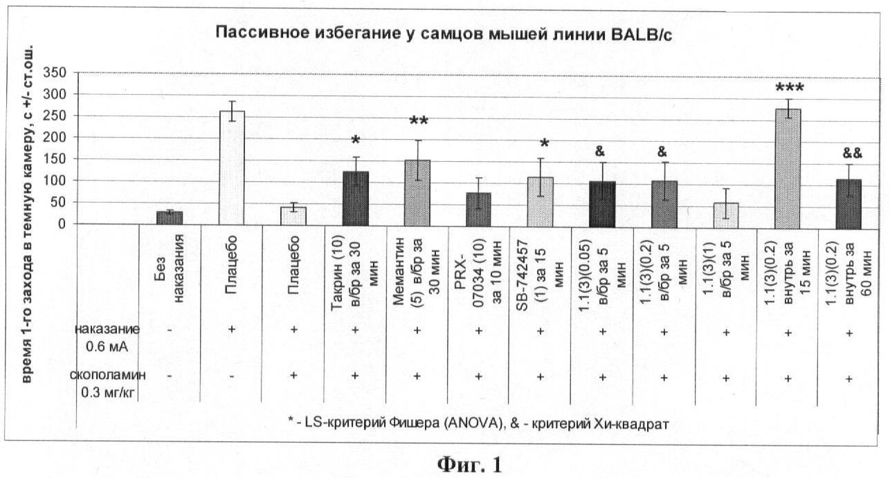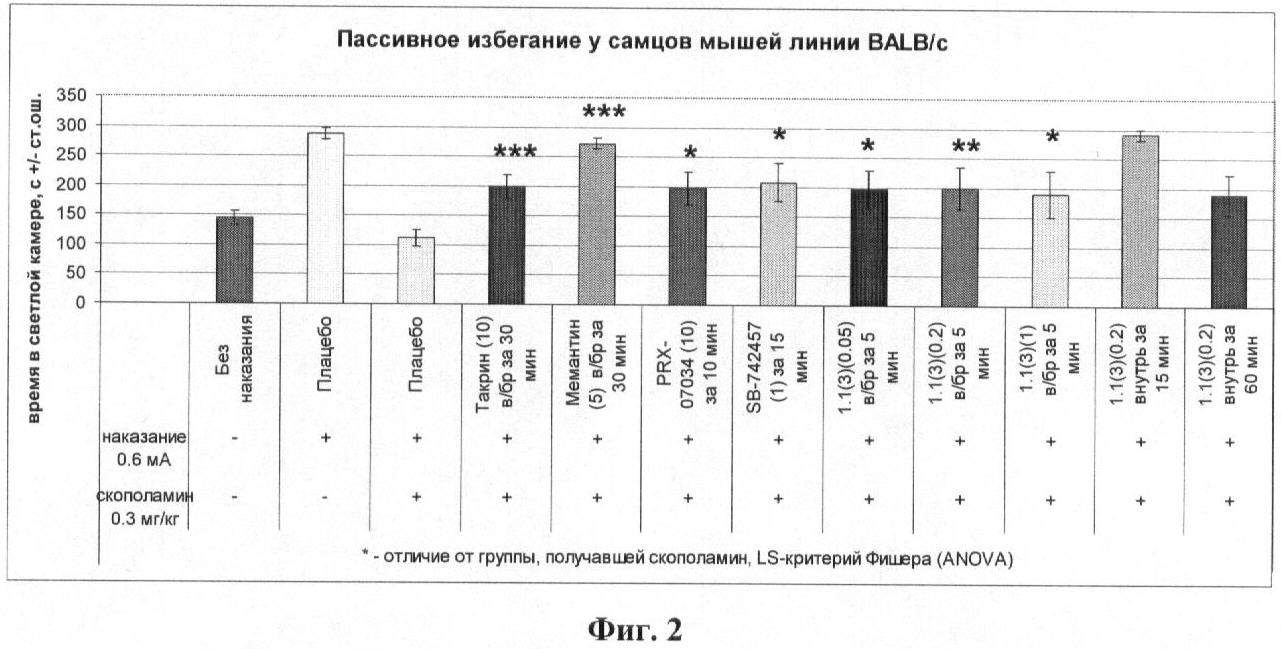 В первый день опыта за 30 мин до обучения мышам внутрибрюшинно вводили МК-801 (0,1 мг/кг), вызывающий амнезию. Животным опытной группы дополнительно вводили одно из следующих веществ: такрин, 10 мг/кг, за 30 мин до обучения; мемантин, 10 мг/кг, за 60 мин до обучения; PRX-07034, 10 мг/кг, за 10 мин до обучения; SB-742457, 1 мг/кг, за 15 мин до обучения или лекарственное начало 1.1(3) (0,05-0,2 мг/кг), за 5 мин до обучения. Животные контрольной группы получали инъекцию физиологического раствора. В каждой группе использовалось 8 животных.