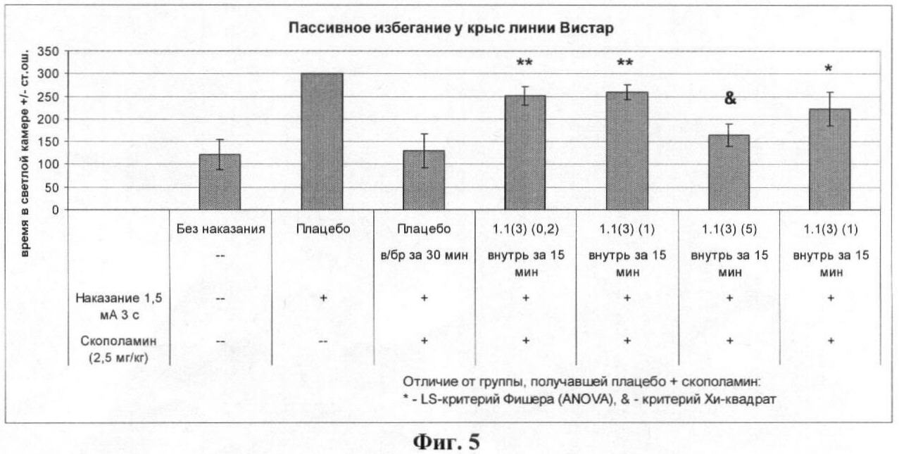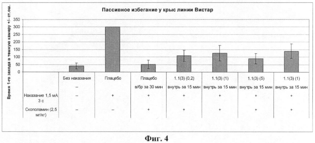 Результаты эксперимента, представленные на фиг.4 и 5, показывают, что пероральное введение лекарственного начала 1.1(3) существенно восстанавливает у крыс память, нарушенную скополамином.