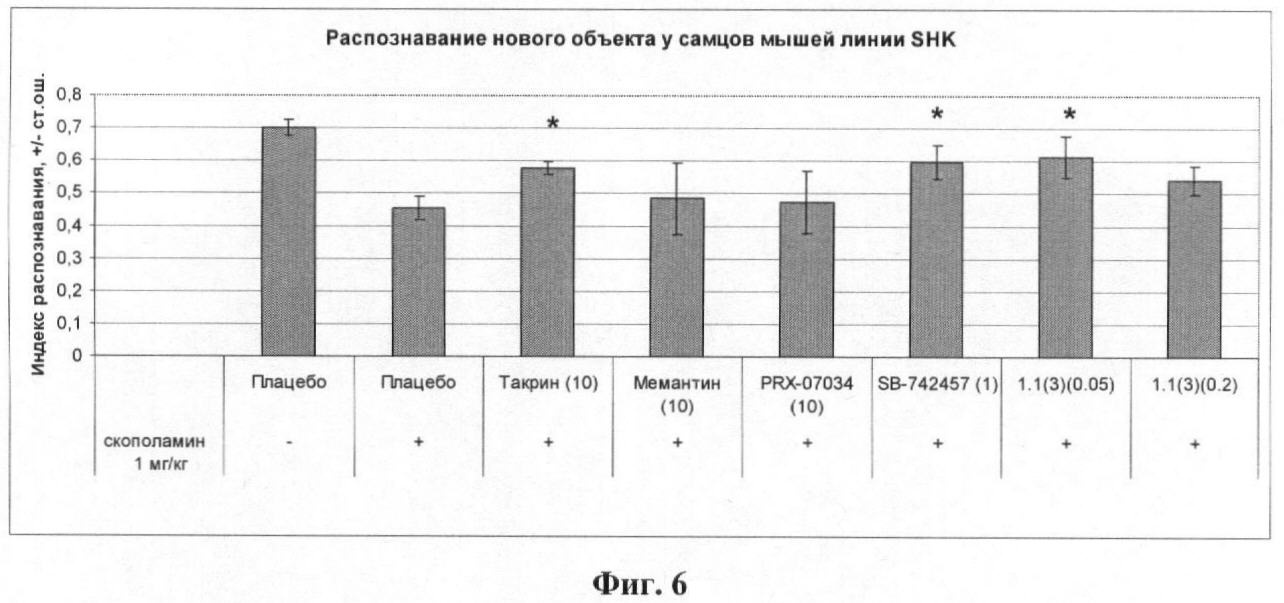Во время обучения животное помещали в лабиринт, в котором в каждой из четырех боковых камер находились по одной одинаковой чашке. Во время теста (спустя 1 ч после обучения) две противоположно стоящих чашки были заменены колбами и животному было позволено исследовать лабиринт. В периоды обучения и тестирования регистрировали время, проведенное животным в каждой боковой камере. Рассчитывали индекс распознавания новых объектов как отношение времени, проведенного в боковых камерах с новыми объектами, к общему времени пребывания в боковых камерах. Появление нового объекта увеличивает время, проведенное животным в камере, по сравнению с фазой обучения (так называемый эффект распознавания новых объектов). Под действием скополамина в дозе 1 мг/кг, введенного внутрибрюшинно за 30 мин до начала обучения, распознавание новых объектов нарушалось и индекс распознавания снижался. Однако это влияние скополамина удавалось предотвратить внутрибрюшинным введением мемантина (10 мг/кг) за 60 мин до начала обучения, такрина (10 мг/кг) за 30 мин до начала обучения, PRX-07034 (10 мг/кг) за 10 мин до начала обучения, SB-742457 (1 мг/кг) за 15 мин до начала обучения или лекарственного начала 1.1(3) (0,05 и 0,2 мг/кг) за 5 мин до начала обучения или SB-742457 (0,2 мг/кг) за 15 мин до начала обучения (фиг.6).