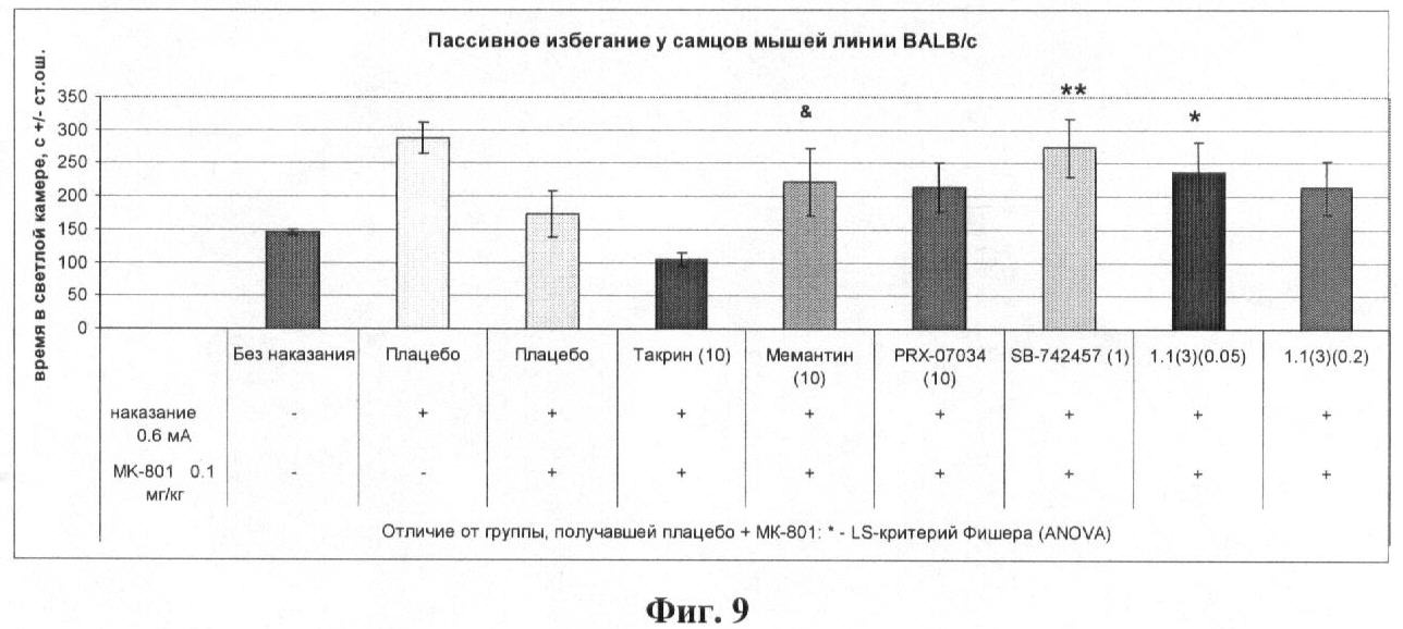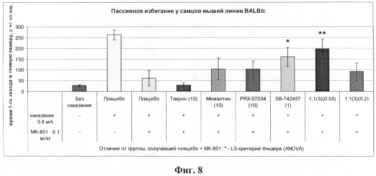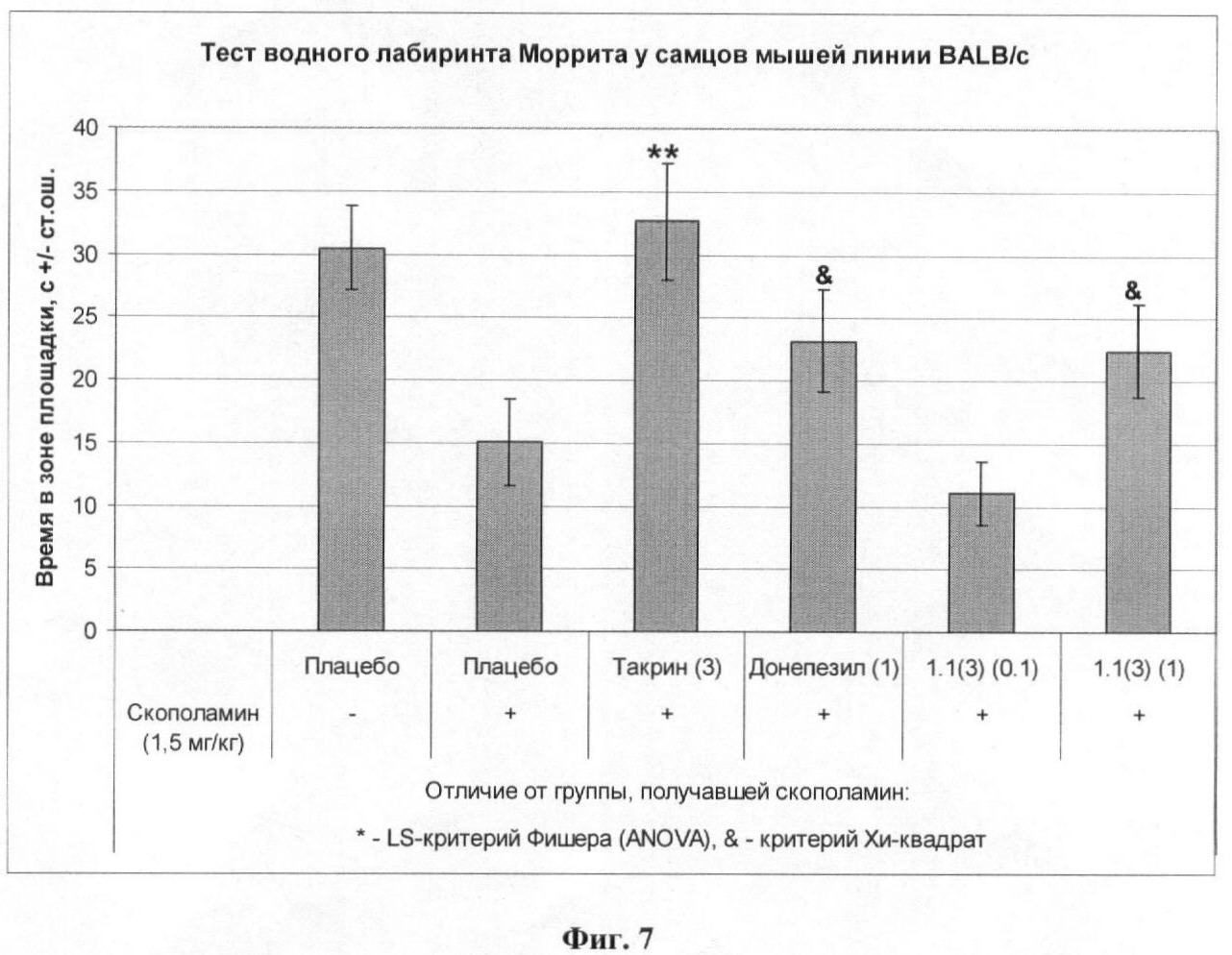 Результаты эксперимента, представленные на фиг.7, показывают, что в тесте водного лабиринта Морриса у мышей лекарственное начало 1.1(3) в дозе 0,1 и 1,0 мг/кг обладает антиамнестическим эффектом, сравнимым с эффектом ингибитора ацетилхолинэстеразы донепезила и такрина.
