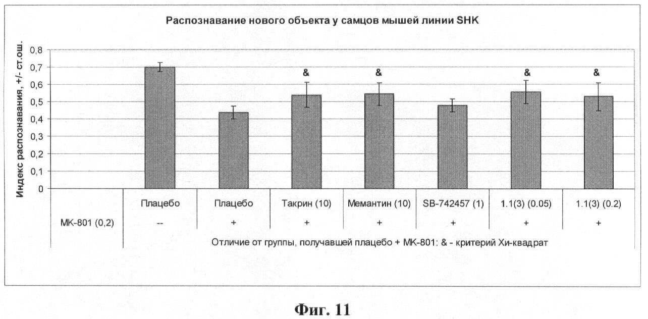 МК-801, снижающий способность к распознаванию новых объектов, вводили в дозе 0,2 мг/кг внутрибрюшинно за 30 мин до начала обучения. Вызванные МК-801 нарушения нивелировались введением мемантина (10 мг/кг) за 60 мин до обучения, такрина (10 мг/кг) за 30 мин до начала обучения, SB-742457 (1 мг/кг) за 15 мин до начала обучения или лекарственного начала 1.1(3) (0,05 и 0,2 мг/кг) за 5 мин до начала обучения (фиг.11).