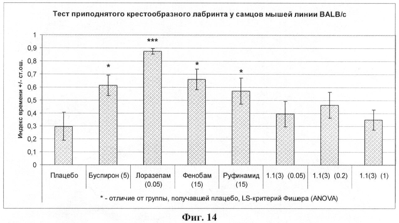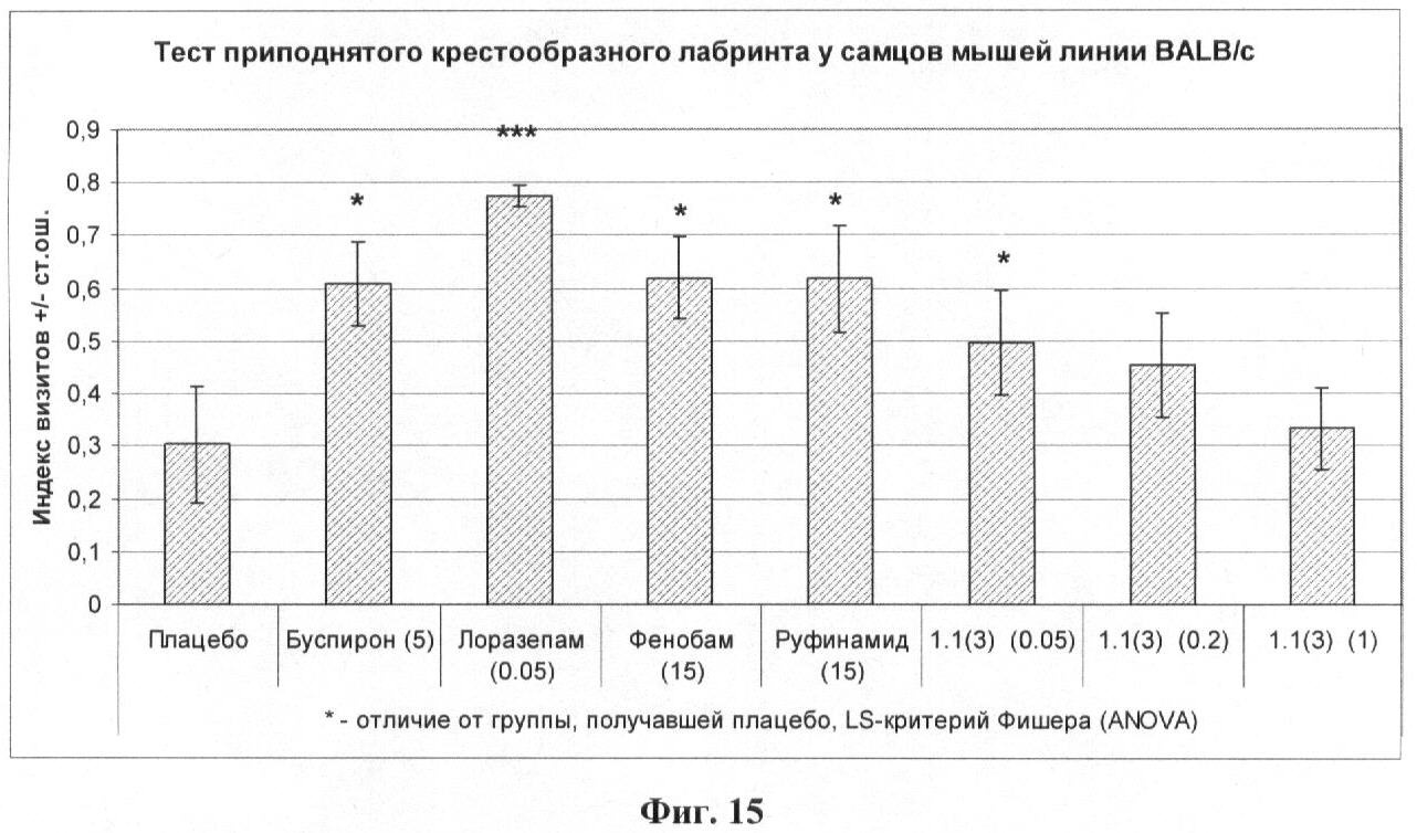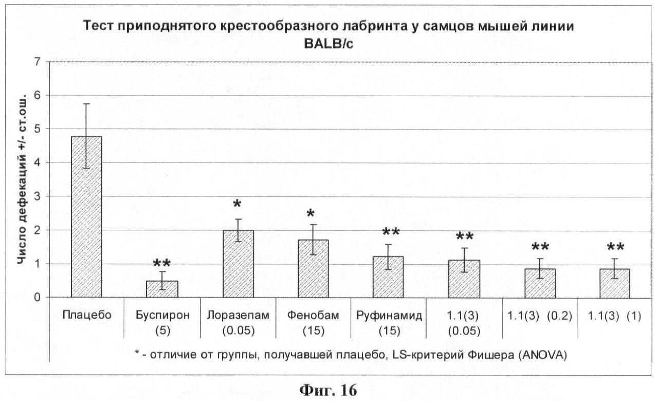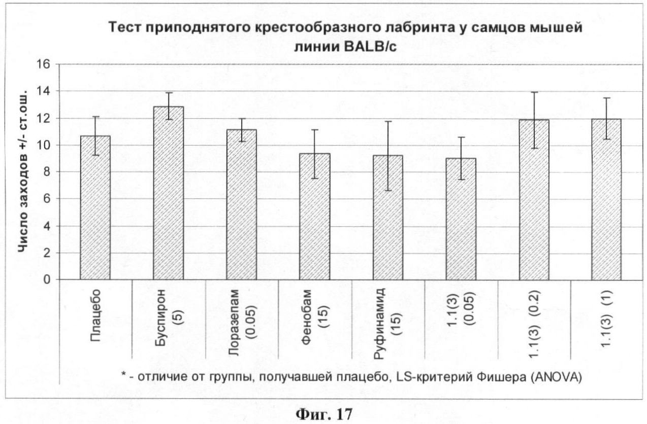 Результаты эксперимента, представленные на фиг.14, 15, 16, 17, показывают, что буспирон и лоразепам оказывали выраженное анксиолитическое действие в тесте приподнятого крестообразного лабиринта, в то время как лекарственное начало 1.1(3) было менее активно.